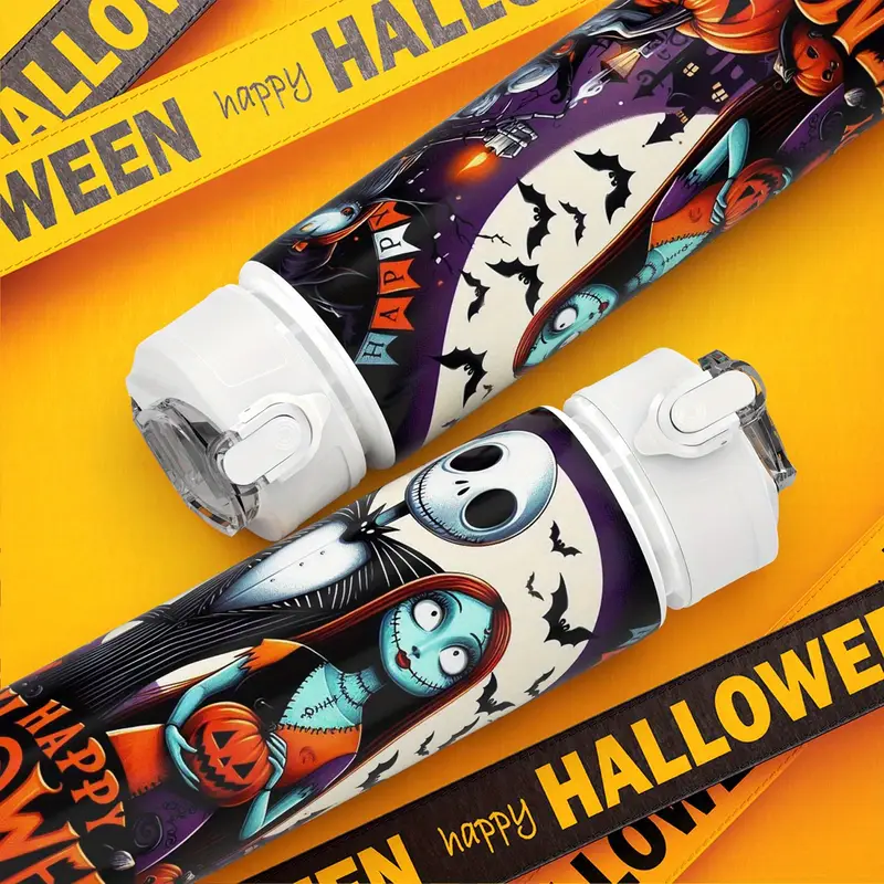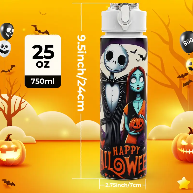 Botella de agua de plástico de Jack el Despertador de Navidad de Disney, diseño impreso lindo, tetera deportiva de plástico, tapa giratoria, taza de agua de plástico reutilizable de 25 onzas/750 ml, ligera, impermeable, ideal para viajes, regalos de cumpleaños, Navidad, Halloween y Acción de Gracias.