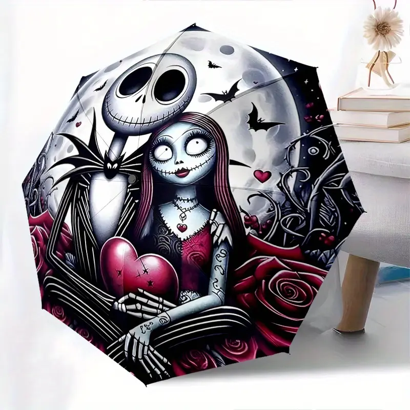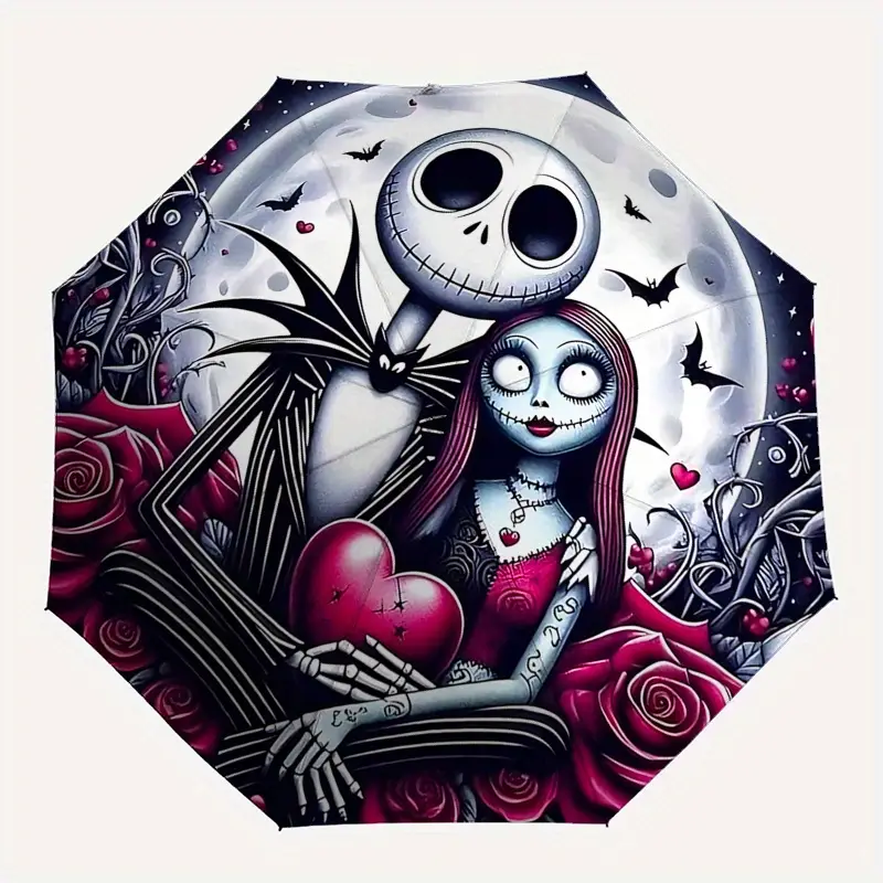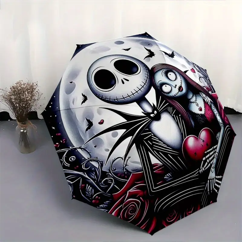 Paraguas Automático de Jack Skellington y Sally de «Pesadilla Antes del Navidad» – Apertura con Botón, Estructura de Hierro Resistente de 8 Varillas, Plegable Tri-Fold para Viajes, Regalo Ideal para Halloween y Navidad – Coleccionista Oficial, Diseño Caprichoso, Construcción Robusta, Para Amantes del Cine.