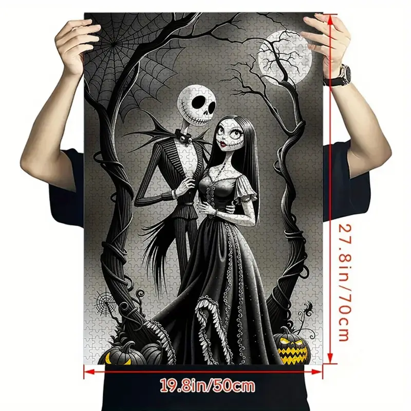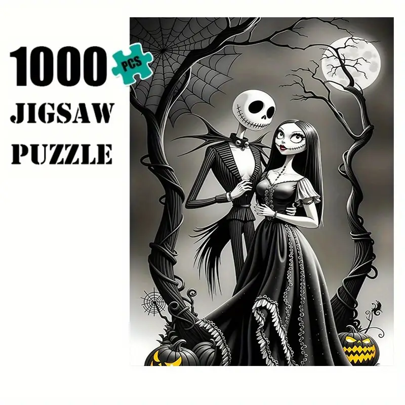 1000 Piezas Puzle de Jack y Sally de «Pesadilla Antes de Navidad» – Noche Iluminada por la Luna, 75x50cm Cartón Grueso para Adultos, Desafío Mental, Regalo de Halloween y Navidad