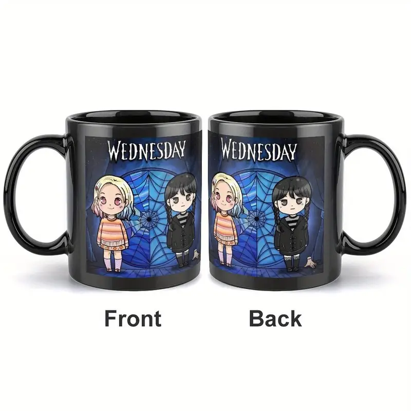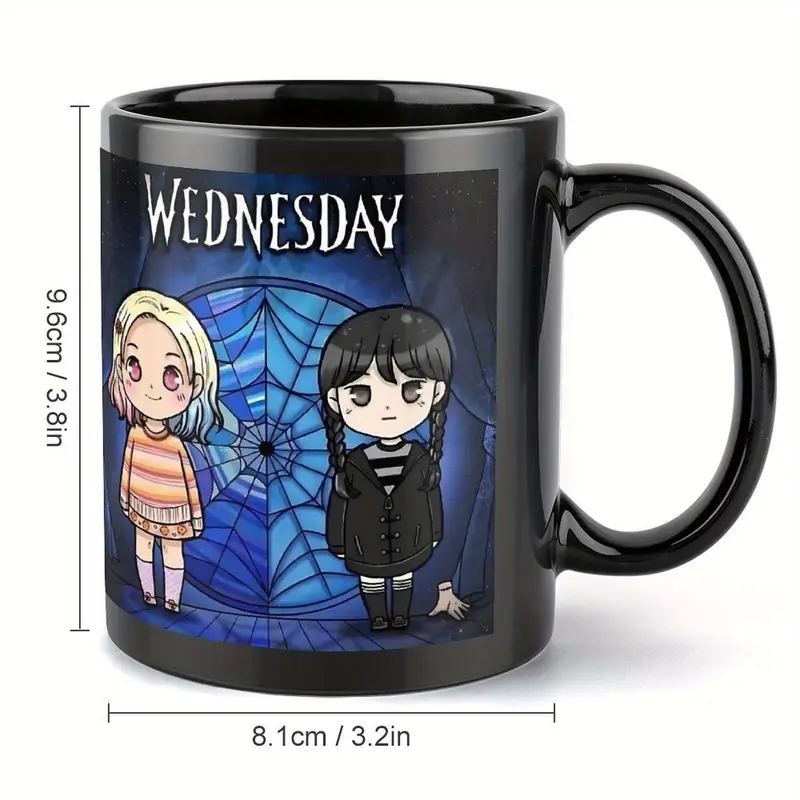 1pc Taza de Café de Porcelana de 11oz con Arte en Vidrio Manchado de Wednesday Addams – Taza Gótica para Café, Té, Leche – Solo Lavado a Mano, Regalo Ideal para San Valentín, Cumpleaños, Navidad, Fiestas de Oficina & Camping al Aire Libre, Vajilla Reutilizable, Ilustración Única, Estética Vintage, Vajilla Duradera, Temática de Bebidas, Para Amantes del Té